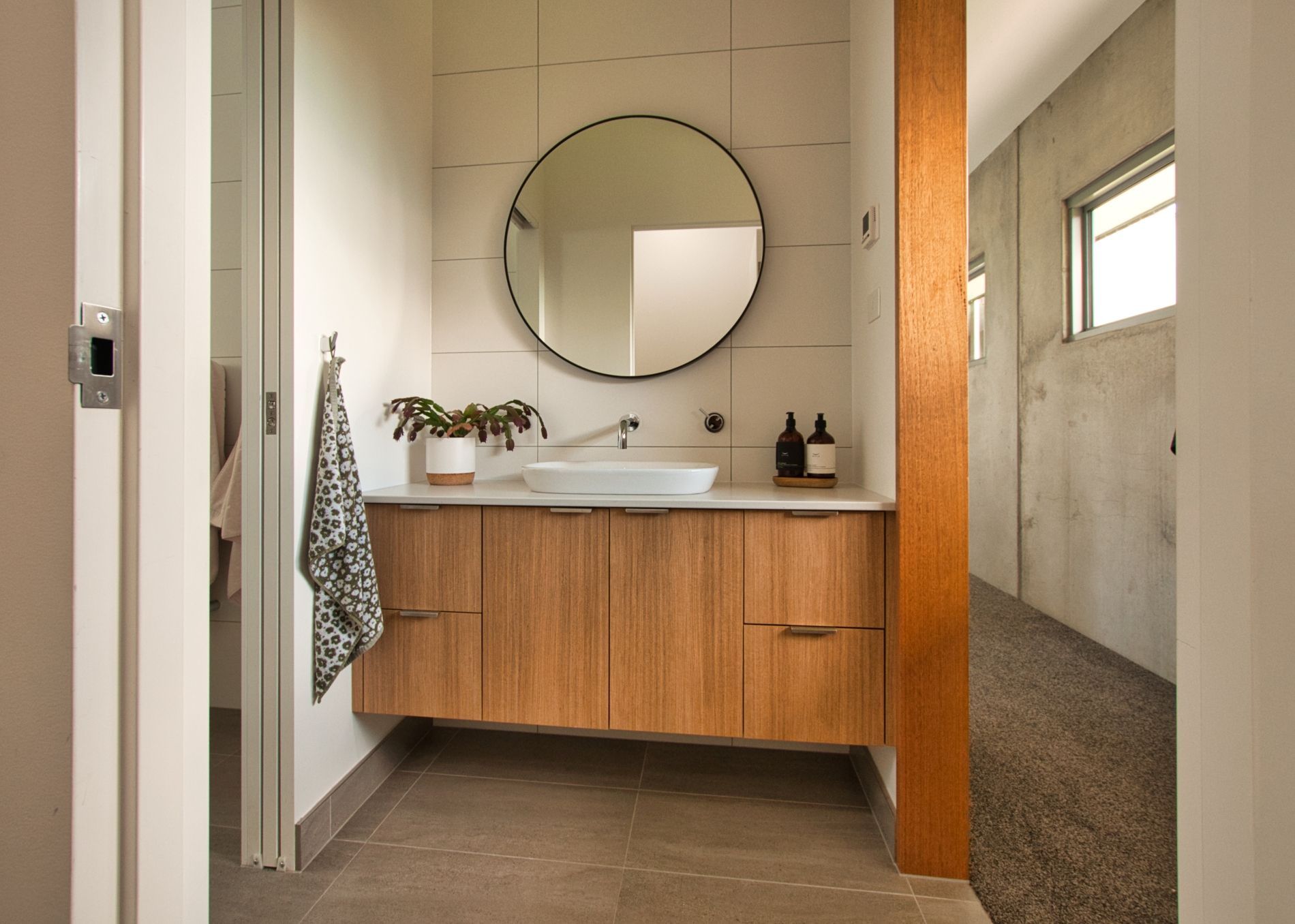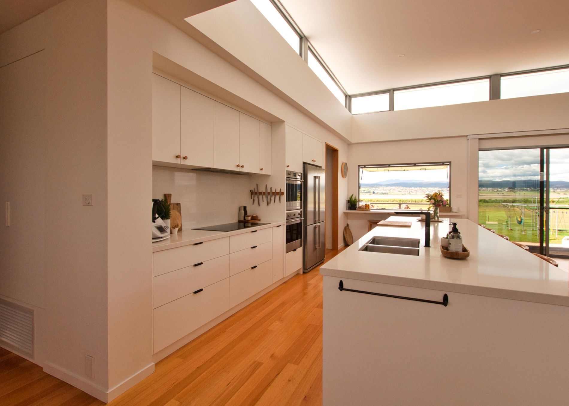 Upon approach, visitors are greeted by a breezeway that leads them into an internal courtyard, which, in turn, guides them to the entrance of the house. Upon entering, one is welcomed into a generously sized open-plan living area that offers views of the river and seamlessly extends into the backyard. Natural light floods this space from all angles, thanks to clearstory windows on all sides of a raised roof.